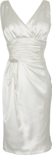 Universally flattering and versatile formal knee-length satin dress with v-neck, cumberbun waist and side draped skirt with crystal pin.