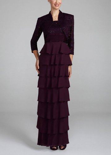 David's Bridal 3/4 Sleeveless Long Lace Jacket Dress Style 1168, Eggplant, 16